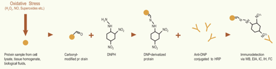 原理 : 蛋白被氧化後會產生碳醯化 (Carbonyl group),因此可利用 DNPH 接上 Carbonyl group,檢測被 ROS 氧化的程度。