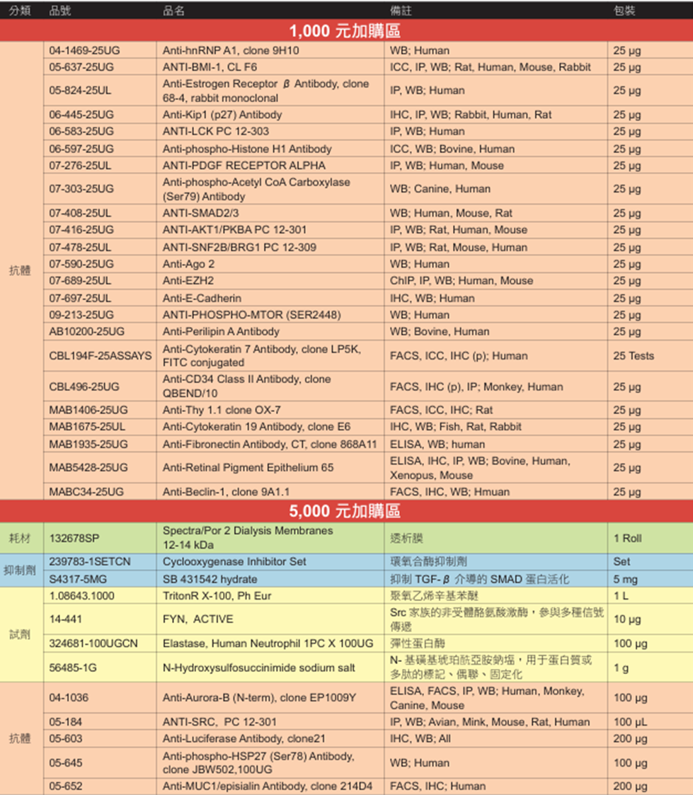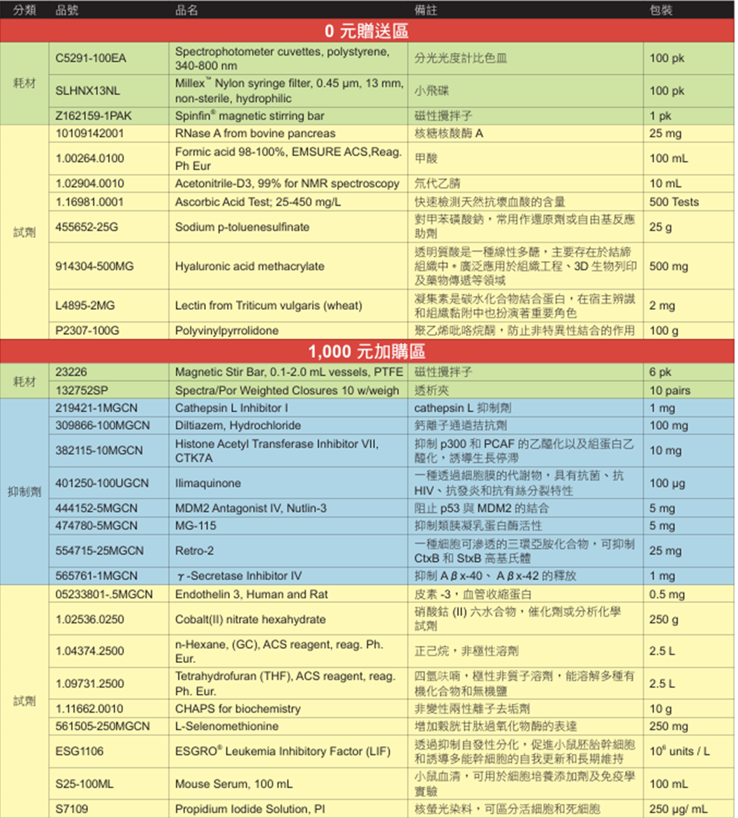 SALE凡購買本目錄任一品項,即可免費獲得或以加購價購買以下產品(一個品項,限購一個。數量有限,送完為止)